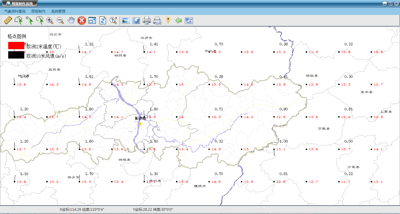 气象要素实现对精细化预报制作产品的查询展示,包括风向、风速、温度、降水量、云量、相对湿度等产品要素数据。
